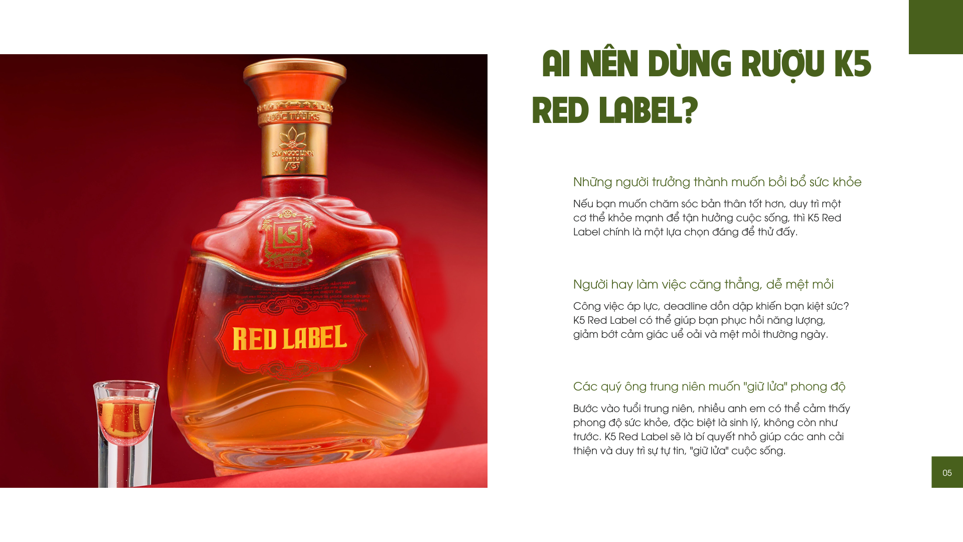 Vậy K5 Red Label dành cho ai? Thật ra, sản phẩm này rất hợp với các anh em ở độ tuổi trưởng thành muốn bồi bổ cơ thể, hoặc đơn giản là muốn tìm một thức uống nhâm nhi họp mặt bạn bè. Đặc biệt, nếu bạn đang tìm kiếm một món quà thật ý nghĩa và sang trọng để biếu tặng sếp, đối tác hay những người thân yêu, K5 Red Label chắc chắn sẽ làm hài lòng mọi người.