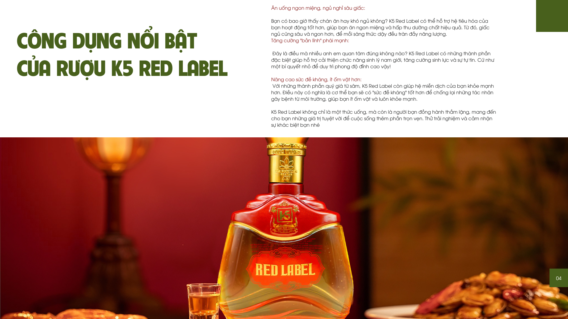 Bạn thấy đó, Rượu K5 Red Label không chỉ là một thức uống, mà còn là bí quyết để bạn nâng cao sức khỏe, khẳng định bản lĩnh và tận hưởng cuộc sống trọn vẹn hơn mỗi ngày. Với những thành phần quý hiếm cùng hương vị êm ái, đây chính là sự lựa chọn hoàn hảo cho bản thân bạn hoặc làm món quà ý nghĩa cho những người thân yêu.