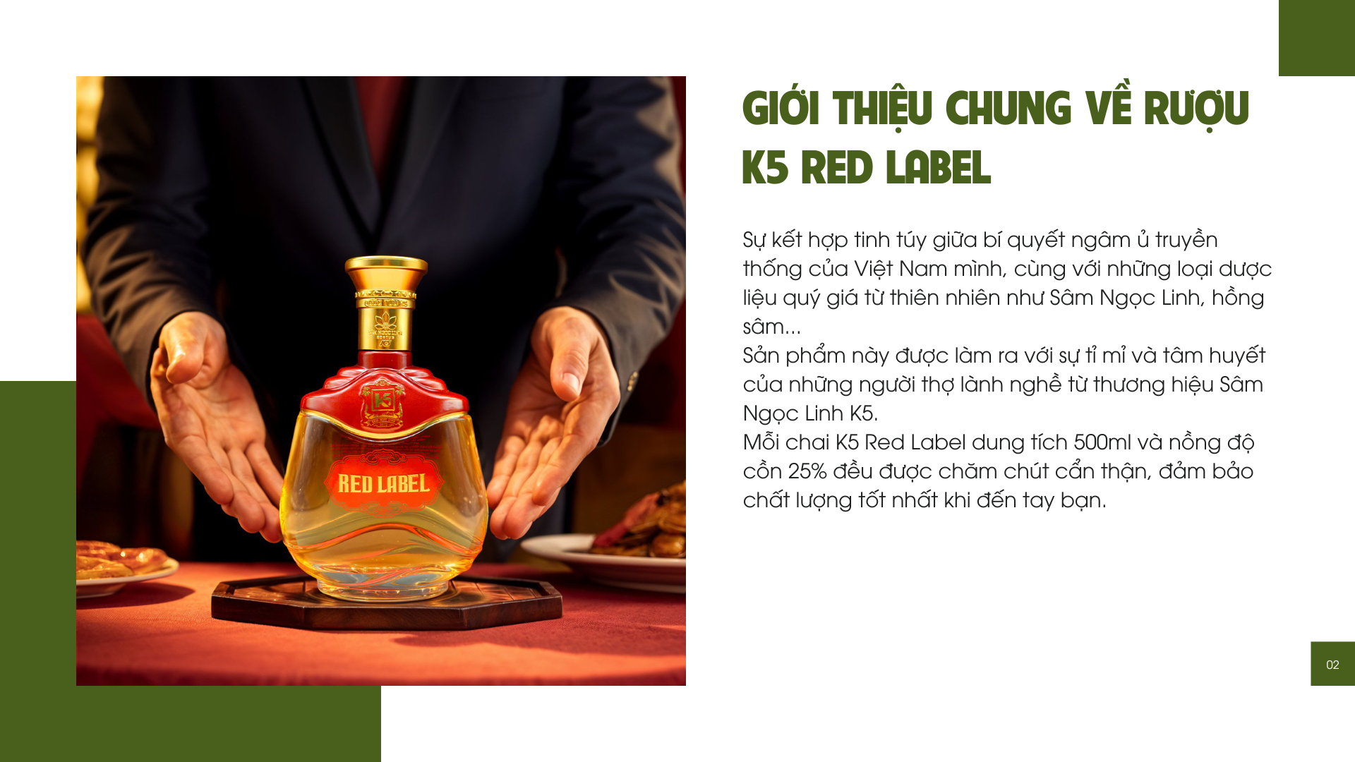 Với 25% ALC, K5 Red Label có nồng độ cồn vừa phải, đủ để phát huy công dụng của các loại thảo dược mà vẫn giữ được sự êm dịu khi thưởng thức. Bạn sẽ không cảm thấy quá gắt hay khó uống đâu nhé.