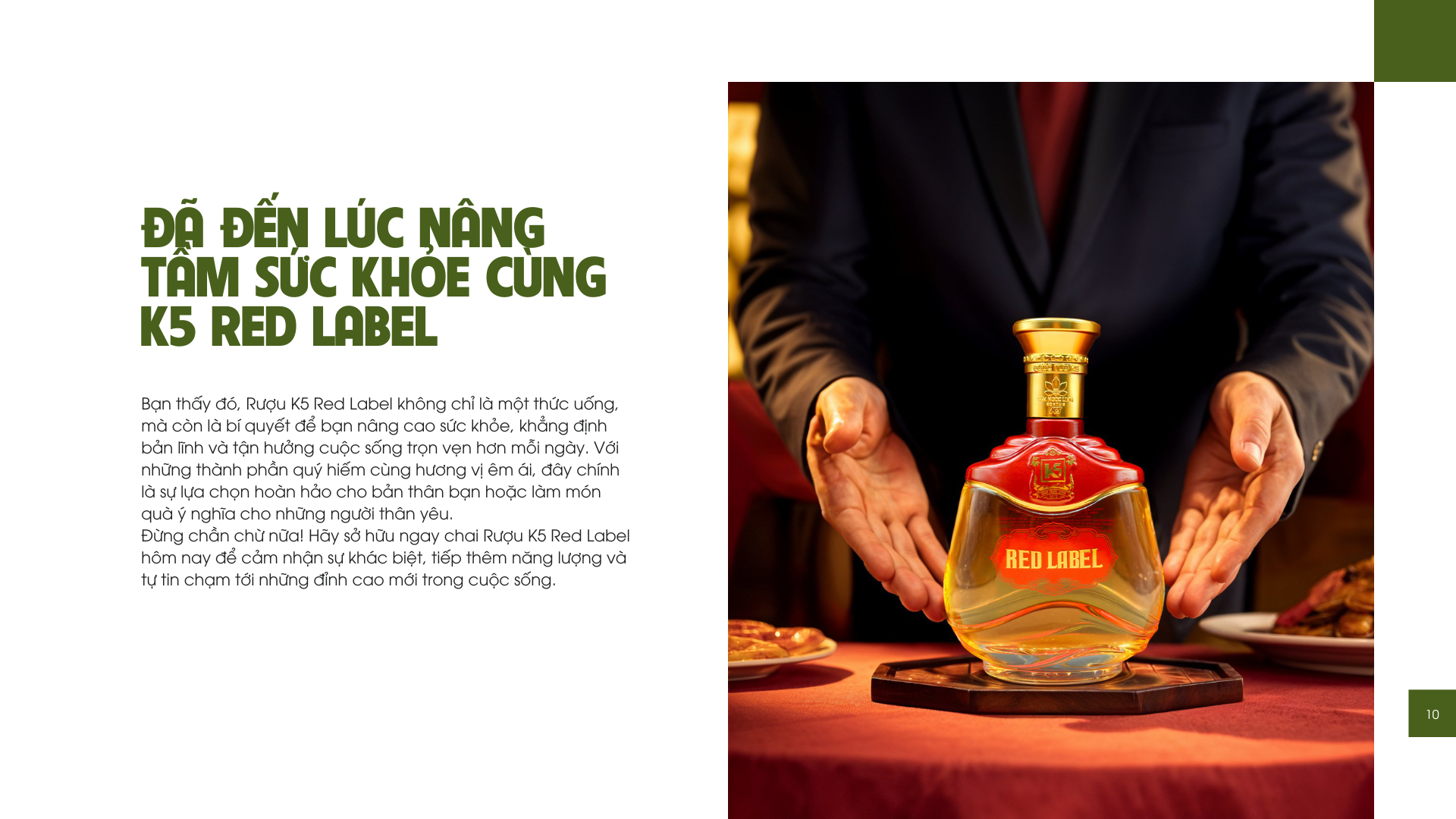Đừng chần chừ nữa! Hãy sở hữu ngay chai Rượu K5 Red Label hôm nay để cảm nhận sự khác biệt, tiếp thêm năng lượng và tự tin chạm tới những đỉnh cao mới trong cuộc sống.