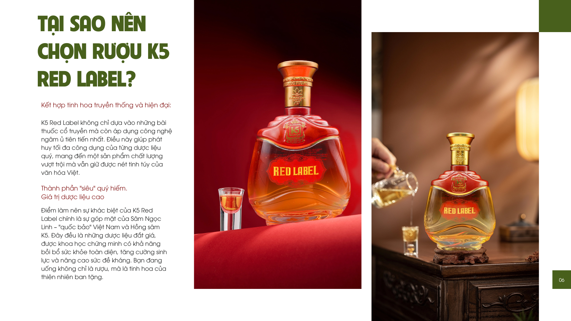 Điểm làm nên sự khác biệt của K5 Red Label chính là sự góp mặt của Sâm Ngọc Linh – “quốc bảo” Việt Nam và Hồng sâm K5. Đây đều là những dược liệu đắt giá, được khoa học chứng minh có khả năng bồi bổ sức khỏe toàn diện, tăng cường sinh lực và nâng cao sức đề kháng. Bạn đang uống không chỉ là rượu, mà là tinh hoa của thiên nhiên ban tặng.