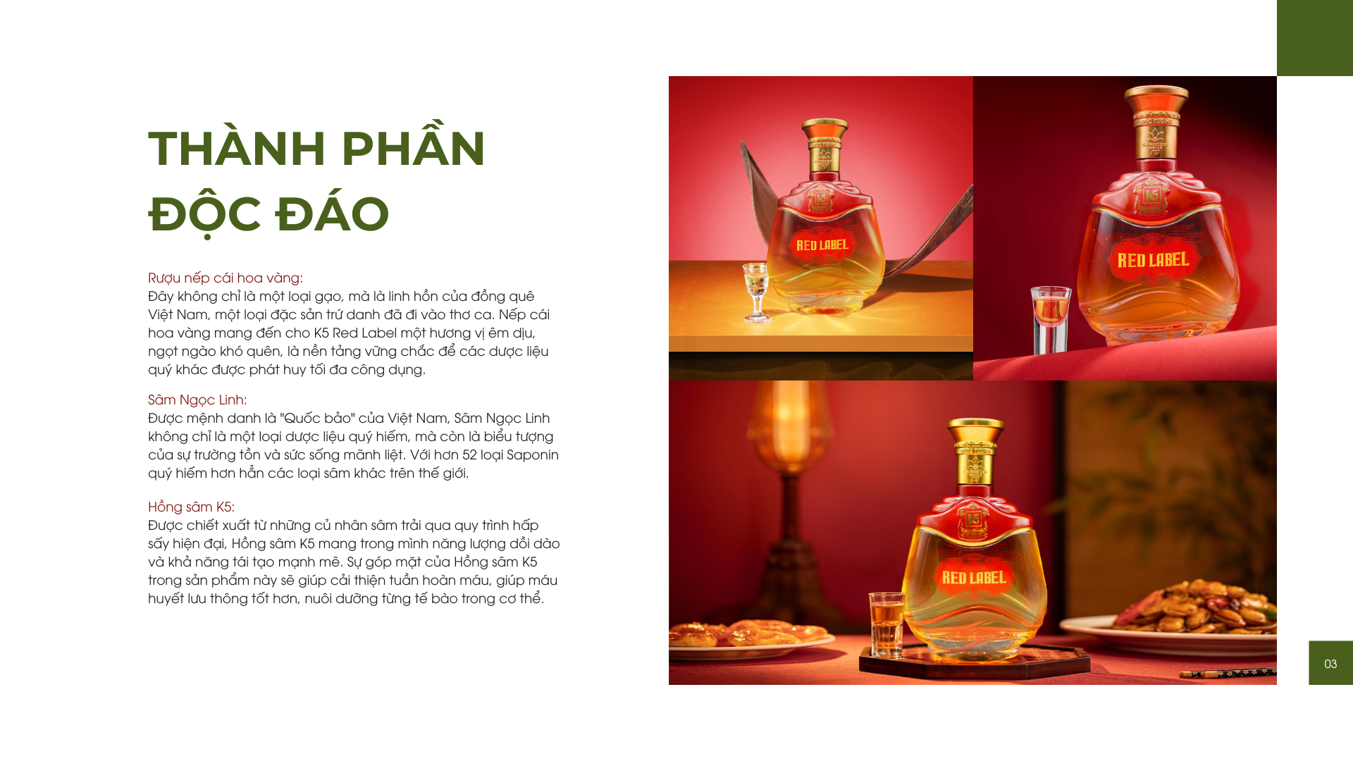 Mỗi thành phần trong K5 Red Label không chỉ là dược liệu, mà còn là nguồn cảm hứng, là lời nhắc nhở về giá trị của tự nhiên và sức mạnh tiềm ẩn bên trong mỗi chúng ta. Hãy cảm nhận và để K5 Red Label đánh thức nguồn năng lượng đó.