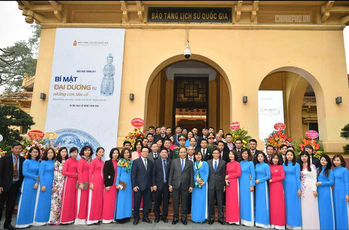 Thủ tướng Nguyễn Xuân Phúc, Phó Thủ tướng Vũ Đức Đam cùng cán bộ, nhân viên Bảng tàng lịch sử Quốc gia Việt Nam. Ảnh VGP/Quang Hiếu