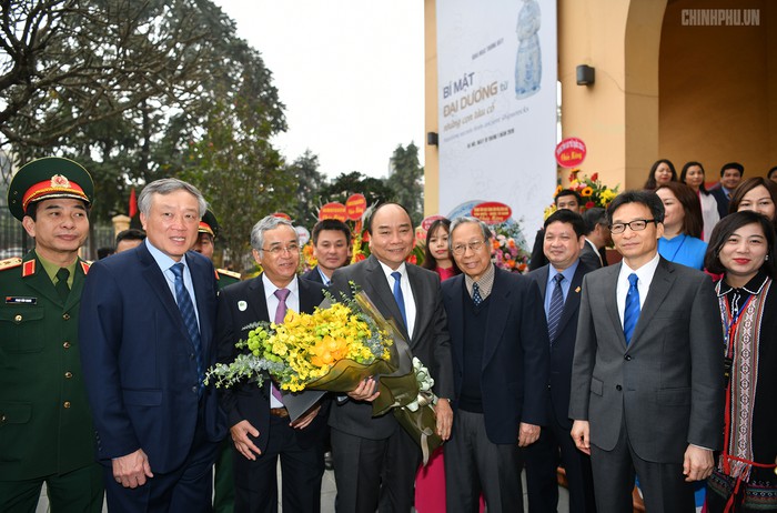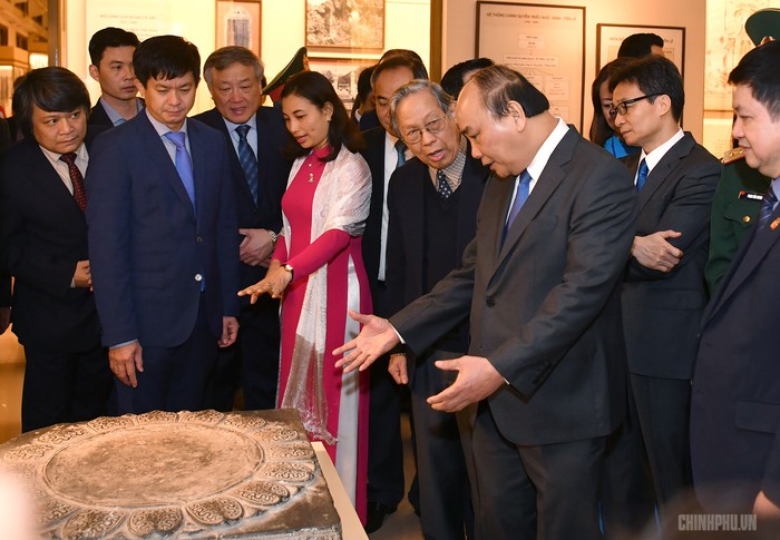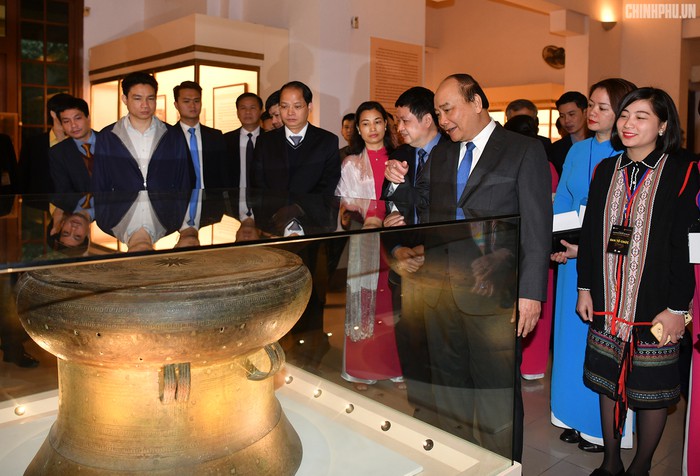 Thủ tướng Nguyễn Xuân Phúc, Phó Thủ tướng Vũ Đức Đam, Chánh án TANDTC Nguyễn Hòa Bình, cùng các đại biểu thăm Bảo tàng Lịch sử quốc gia Việt Nam. Ảnh VGP/Quang Hiếu
